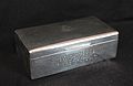 A sterling silver cigarette case measuring 6.5" x 2.25" x 3.25". Lined with cedar with an adjustable divider. Case is engraved on the top with the crest of the Royal Canadian Corps of Signals and on the front with the inscription: