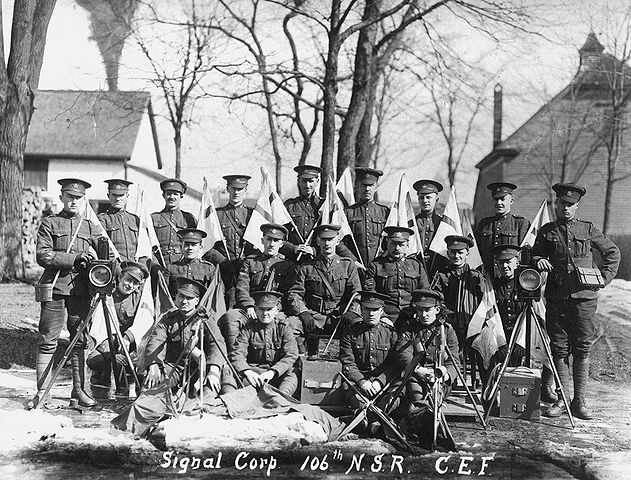 Equipment shown in this photo includes signalling telescopes, Signalling flags and Begbie signalling lamps.