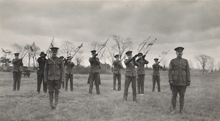 Signallers of the 109th Battalion at flag drill on the plains at Leaside. Dated 2 April 1915.