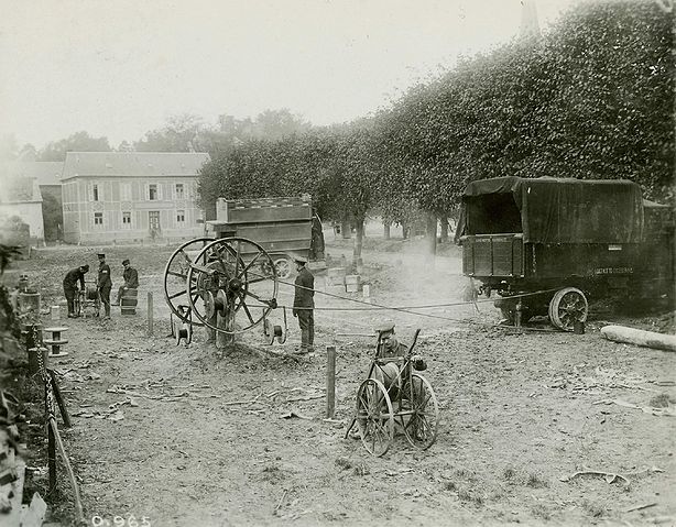 Telephone wire being rolled into big cable with power supplied by Motor Lorry. October, 1916. The wire is being rolled onto a Barrows Drum Universal.