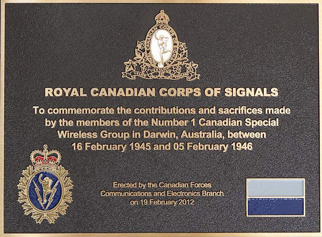 Photo of the No. 1 Canadian Special Wireless Group memorial plaque presented at Darwin, Northern Territory, Australia on 19 February 2012.