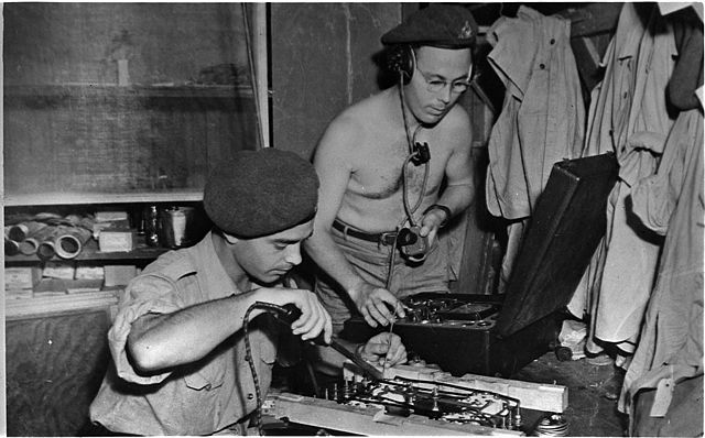 Canadian Signalmen in Australia - Members of 1 Canadian Special Wireless Group training for action in the Pacific now stationed in Brisbane, Australia, are cheerful despite the hottest March weather in 42 yrs. Shown here testing Canadian radio equipment in Australia are: Sgmn J.P. Trottier, and Sgmn Maywood.
