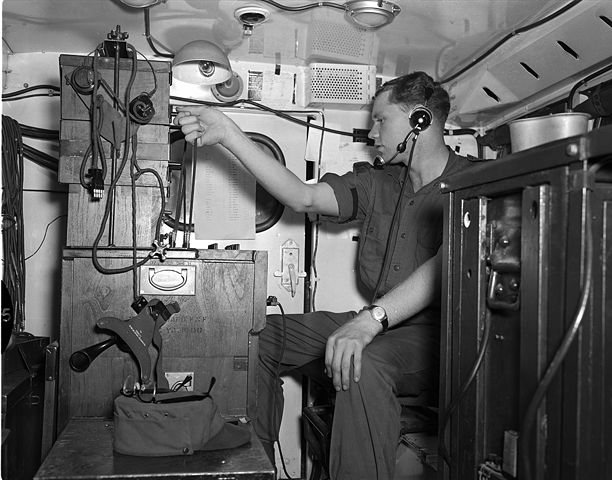 Caption: Signalman Leroy Dorr operates a Switchboard of 2 Signal Squadron now training with the 2nd Canadian Infantry Brigade Group at Camp Petawawa, Ont. Photograph is of the interior of a M152 Panel Truck.