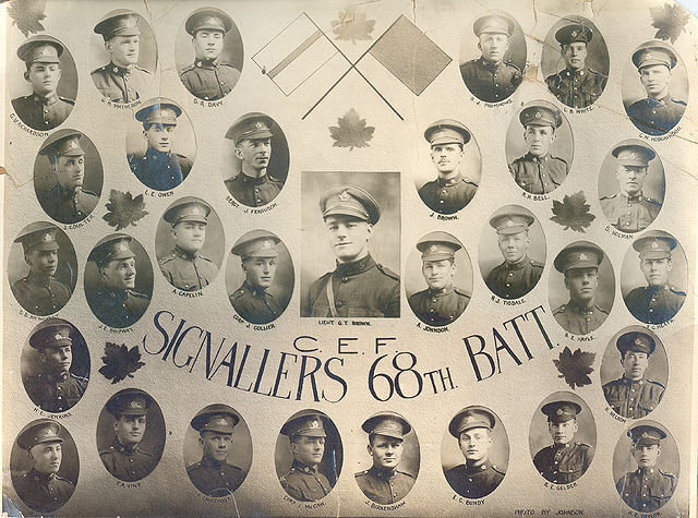 A poster featuring individual photos of the Signallers of the 68th Battalion CEF. Middle right is Frank Heath.