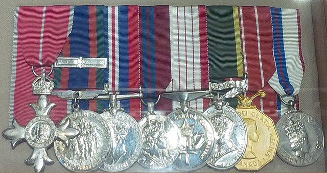 The medals are (left to right): Member of the Most Excellent Order of the British Empire (MBE), Canadian Volunteer Service Medal with overseas bar, 1939-45 War Medal, Queen Elizabeth II Coronation Medal, Canadian Centennial Medal, Canadian Efficiency Medal, Canadian Forces Decoration, Queen Elizabeth II Silver Jubilee Medal (in wrong order of precedence, should appear after the Centennial Medal however, as it was likely awarded after retirement, the entire set was not remounted).
