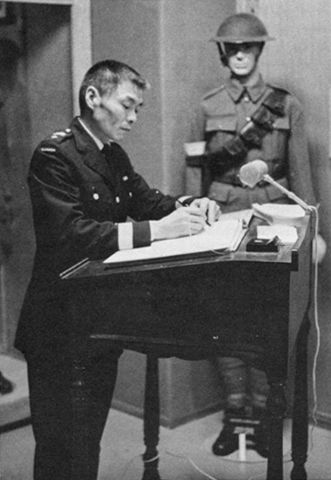 Brigadier General Sugimoto is the first to sign the new visitors register at the Signals Museum.