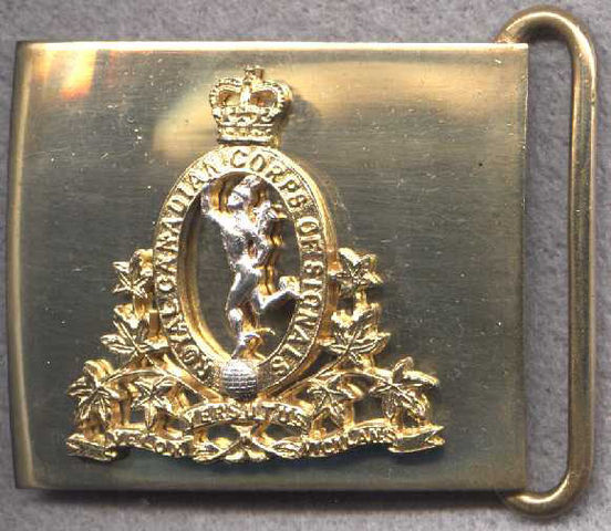 This is an example of a belt buckle featuring a cap badge style crest on it. This version is a Officers' style cap badge, gilt and silver, with a small crown and vertical lugs for attaching the badge to the backing.