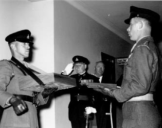 Placing of the Book of Remembrance at the Forde Building during the Royal Canadian Corps of Signals Jubilee Parade on 22 September 1963. Shown in the School Adjutant Capt Kidd receiving the book from the Parade Commander. BGen Beament, Colonel Commandant is saluting in the background.