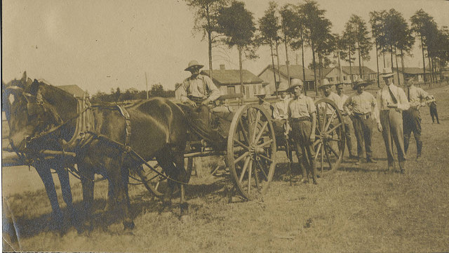 Photo of a cable wagon at an unknown location. Standing at far right with hand on hip is Elroy Forde.