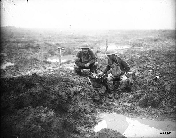 Canadian Signal Section trying to get a connection. Battle of Passchendaele. November, 1917.