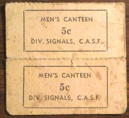 5 cent canteen tokens for the men's canteen of 1st Canadian Divisional Signals. These tokens predate November 1940 as that is when the C.A.S.F. designation was dropped.