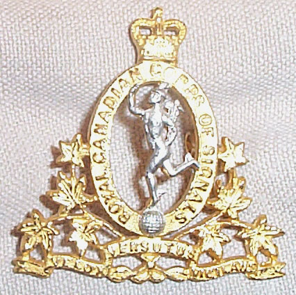 RCCS QC Officers' gilt & silver cap badge with small sized crown (9 mm W x 8 mm H). Lug type fasteners.