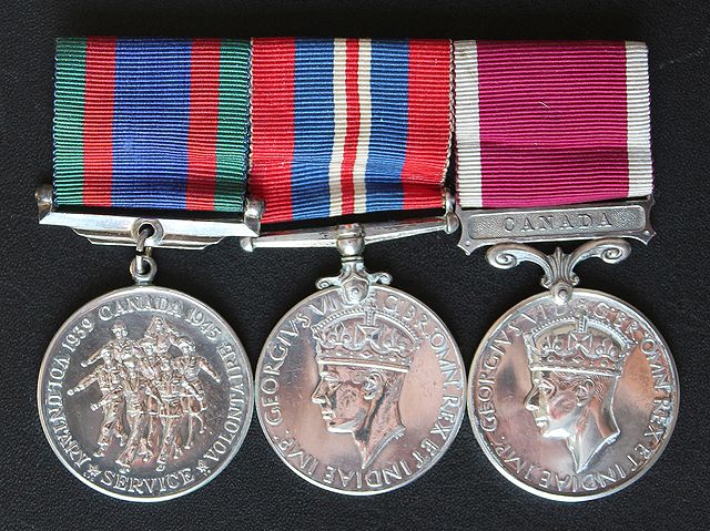 The medals are (left to right): Canadian Volunteer Service Medal, 1939-45 War Medal, Canadian Long Service and Good Conduct Medal.