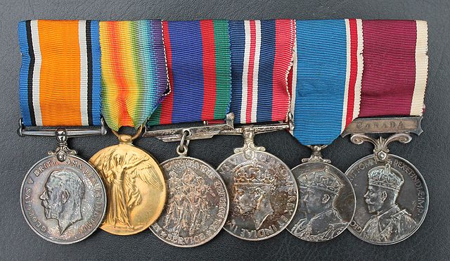The medals are (left to right): British War Medal, Victory Medal, Canadian Volunteer Service Medal, 1939-45 War Medal, King George VI Coronation Medal, Canadian Medal for Long Service and Good Conduct.