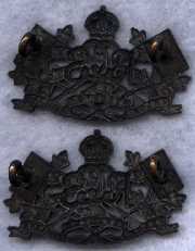 RCCS KC officers' bronze collar badge, worn on the service dress uniform. This variation incorporates the solid crown, and is hollow backed. Fasteners are lug type.