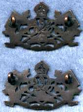 Variation of the RCCS KC officers' bronze service dress collar badge with solid crown and solid back. Fasteners are lug type. Not maker marked, but probably manufactured by William Scully