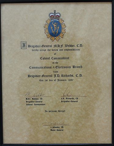 Transfer certificate signed on 1 January 1987 when Brigadier General M.H.F. Webber, CD took over the position of Colonel Commandant of the Communications and Electronics Branch from BGen J.D. Richards, OMM, CD.