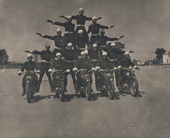 An undated photograph of The Royal Canadian Corps of Signals Royal Canadian Corps of Signals Despatch Rider Display Team.