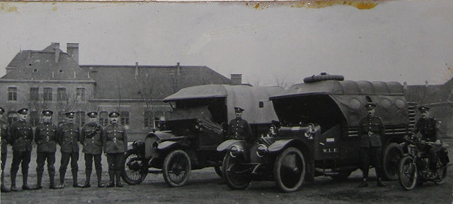 Photo features early signals vehicles. Lorry to the right is a Crossley and the other is unidentified.