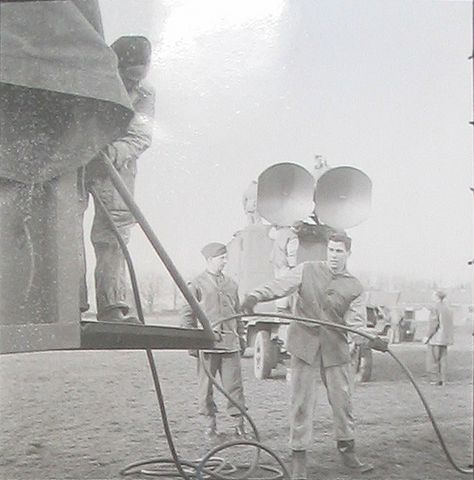 One of a series of photos showing the Canadian GL III(c) gunlaying radar. The photos are dated 26 Jan 1943 and show an early example of Radar (originally known as Radiolocation) equipment in then in use by 1 Canadian Radiolocation Unit. This photo specifically shows the APF trailer in the background with twin parabolic antennae in operating position.