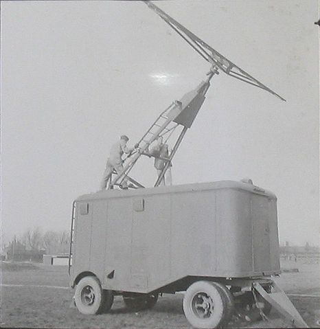 One of a series of photos showing the Canadian GL III(c) gunlaying radar. The photos are dated 26 Jan 1943 and show an early example of Radar (originally known as Radiolocation) equipment in then in use by 1 Canadian Radiolocation Unit. This photo specifically shows the ZPI trailer with its antenna being raised.