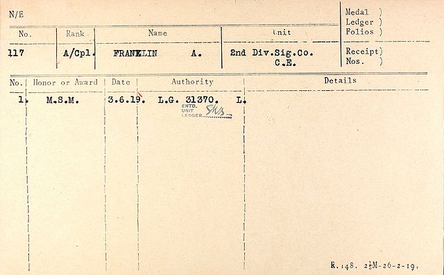 Franklin, Alfred medal card MSMB