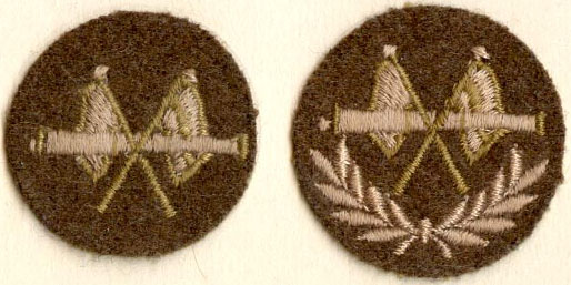 Trade badges for Gunner Signallers of the Royal Canadian Armoured Corps. They were worn by armoured gunners trained in signalling and not by members of the Royal Canadian Corps of Signals. Only made for Group 1 and 2. It is believed these badges were produced only in limited quantities as, even while being initially introduced, a change of badge for the trade was envisaged.