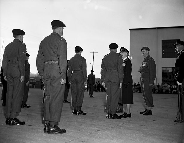 Her Royal Highness, Mary, The Princess Royal inspects soldiers of the Royal Canadian Corps of Signals at Jericho Beach RCAF Station 22 October, 1955.