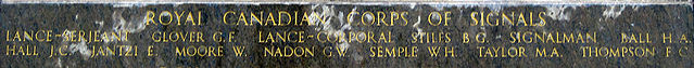 Memorial for members of the Royal Canadian Crops of Signals at Cassino War Cemetery. Names listed are: