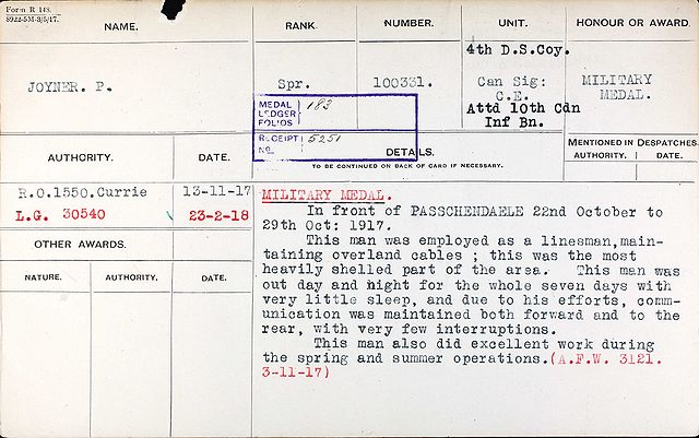 Joyner, Percy medal card MM