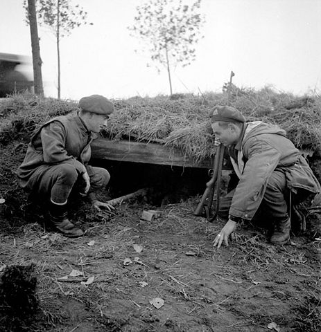 Sergeants M.J. Gendron and R.L. O'Hara of the Royal Canadian Corps of Signals (R.C.C.S.), 2nd Canadian Infantry Division, examining a concealed German anti-tank gun position on the Beveland Causeway, Netherlands, 27 October 1944 Date(s): October 27, 1944 , Place of publication: Netherlands, Conditions of Access Graphic (photo) (Copy negative) PA-131254 90: Open Nil Terms of use Credit: Lieut. Ken Bell / Canada. Dept. of National Defence / Library and Archives Canada / PA-131254 Restrictions on use: Nil Copyright: Expired Additional name(s) Photographer Bell, Ken Photographer Bell, Ken, 1914- Reference Numbers Copy negative: PA-131254 Other accession no.: 1967-052 NPC Additional Information Subject heading MILITARY - OPERATIONS - LAND - 1944/09/27 Army Language of material no language Source. Government Other system control no.: DAPDCAP462858 MIKAN No. 3524149