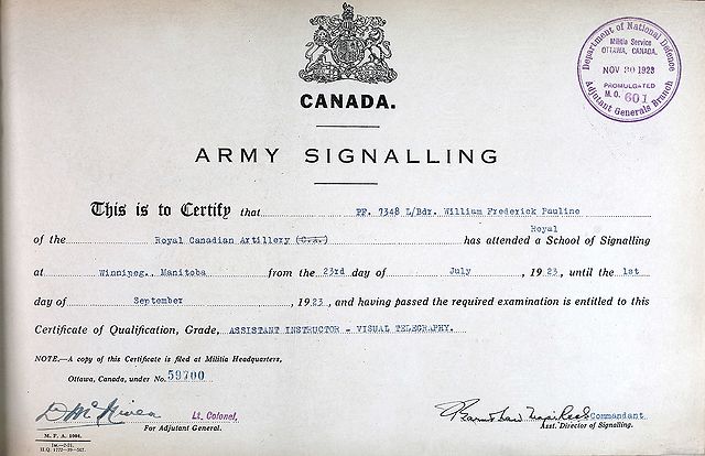A copy of Lance Bombadier W.F. Pauline's signalling certificate from 1923.