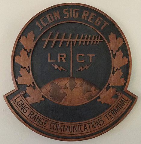 The Long Range Communications Terminal crest, 1st Canadian Division Headquarters and Signal Regiment, carved of Honduran mahoghany and measuring 16" tall x 14" wide. Variations of these were produced during the two rotations that served with ONUCA c1990.