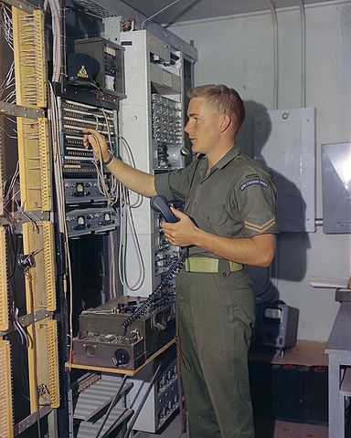 Summer Concentration Gagetown 1963. Shown is a RCSigs Corporal at a line patch panel. Shown are a TA-43 field phone.