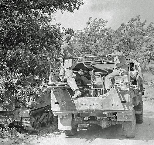 A photo of a Canadian line crew taken somewhere in Italy. Vehicle is a 15-cwt lorry fitted with a Cable Layer Mechanical No 2 or similar cable layer.
