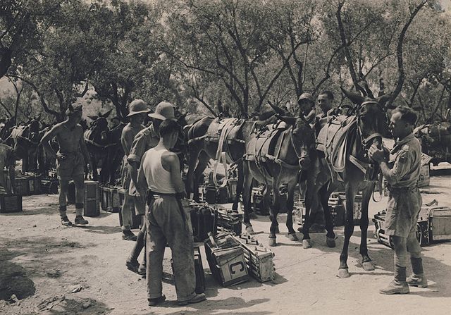 A photo of mules being loaded with equipment during Operation Husky, the invasion of Sicily during the Second World War.
