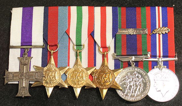 The medals are (left to right): Military Cross, 1939-1945 Star, Italy Star, France and Germany Star, Canadian Volunteer Service Medal with overseas bar, 1939-45 War Medal with Mentioned in Despatches oak leaf.