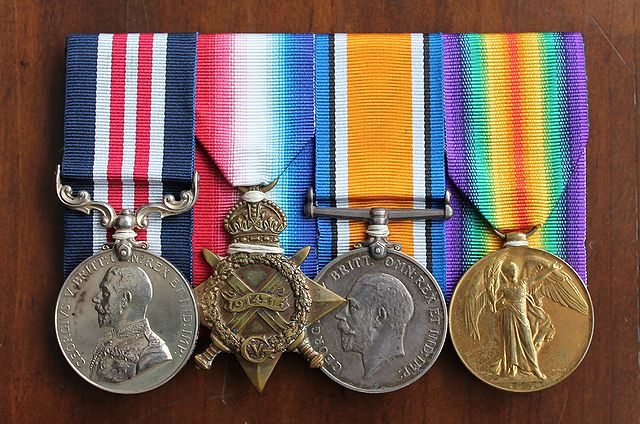 The medals are (left to right): Military Medal, 1914-15 Star, British War Medal, Victory Medal.