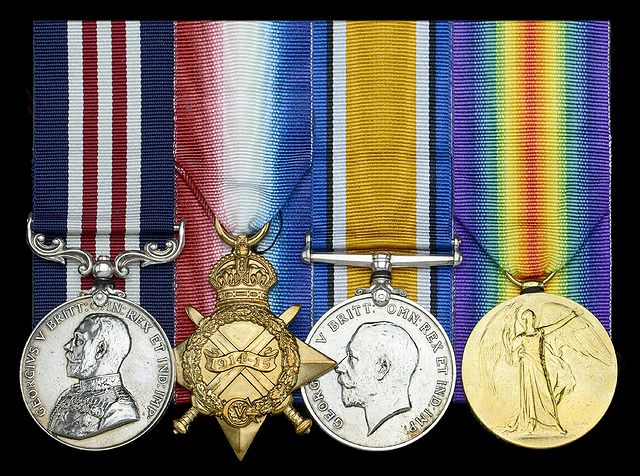 The medals are (left to right): Military Medal, 1914-15 Star, British War Medal, Victory Medal.