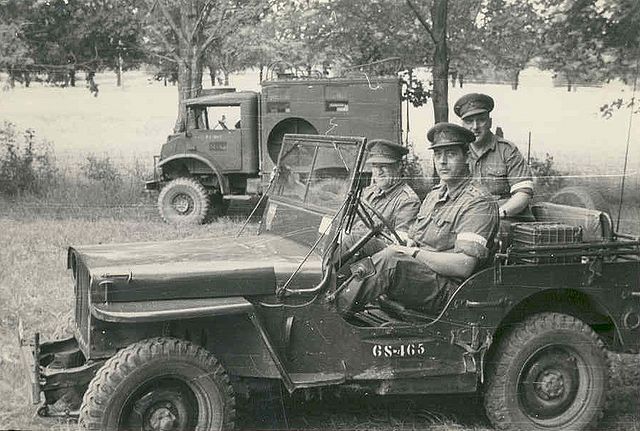 A photo from a militia concentration c 1950s. The military continued to use Second World War era vehicles and this photo has both a Car 5-cwt 4x4 (jeep) in the foreground and a 15-cwt wireless van in the background.