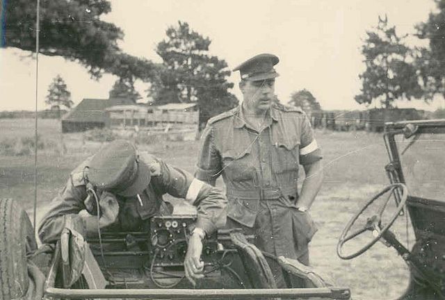 A photo from a militia concentration c 1950s. Being adjusted is a R209 Reception Set in the back of a Second World War era Car 5-cwt 4x4 (jeep).
