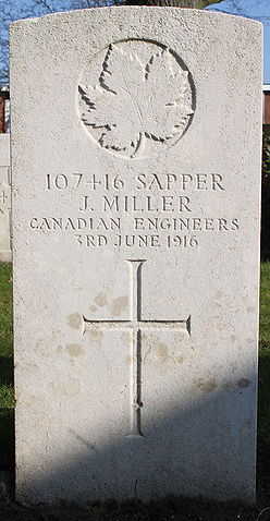 Grave marker for Miller, James in Poperinghe New Military Cemetery.