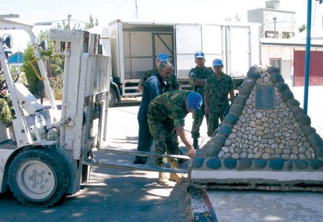 The United Nations Disengagement Observer Force Memorial being delicately maneuvered during disassembly in Camp Ziouani.