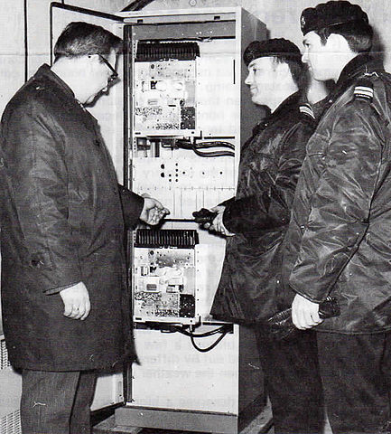 Caption: New rebroadcast equipment installed by NBTel for the Canadian Armed Forces in the Petersville area of Camp Gagetown is shown being checked by D.J. Crawford, Supervisor - Mobile Sales; Major john Dicker and Captain Dave Pettigrew. The rebroadcast facility is used for safety purposes.