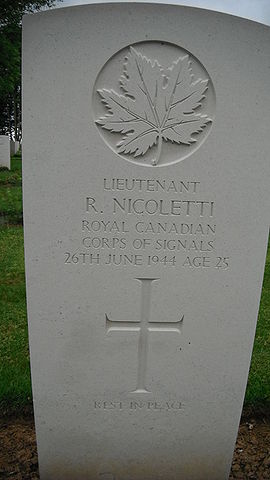 Grave marker for Nicoletti, Roland in Beny-sur-Mer Canadian War Cemetery.