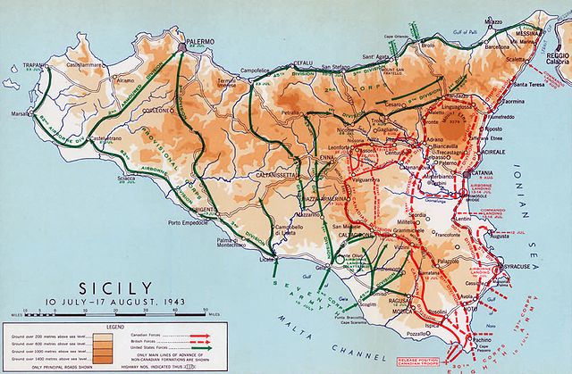 A battle map of OPERATION HUSKY, the Allied invasion of Sicily, in 1943 during the Second World War.