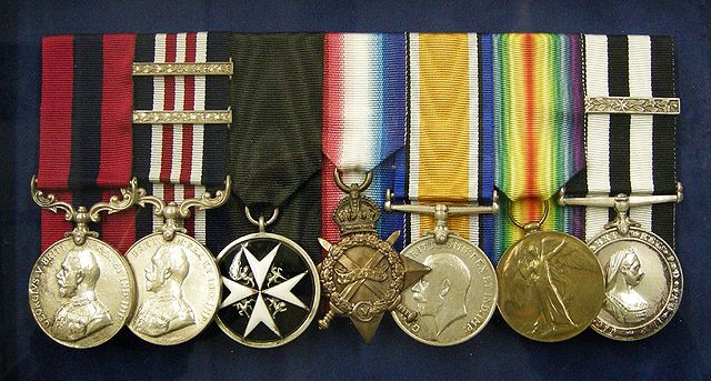 The medals are (left to right): Distinguished Conduct Medal, Military Medal with two bars, Order of St. John, 1914-15 Star, British War Medal, Victory Medal, Service Medal of the Order of St John with bar.