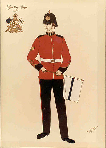 A print showing an historical capbadge and uniformed soldier related to the Royal Canadian Corps of Signals. This print is part of a series produced by MCpl Ed Sketcher during his time at 1 Canadian Signal Regiment c1980.