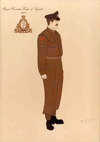 A print showing an historical capbadge and uniformed soldier related to the Royal Canadian Corps of Signals. This print is part of a series produced by MCpl Ed Sketcher during his time at 1 Canadian Signal Regiment c1980.