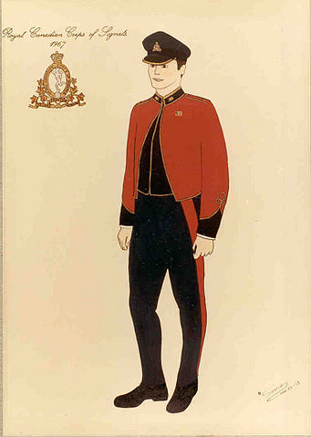 A print showing an historical capbadge and uniformed soldier related to the Royal Canadian Corps of Signals. This print is part of a series produced by MCpl Ed Sketcher during his time at 1 Canadian Signal Regiment c1980.